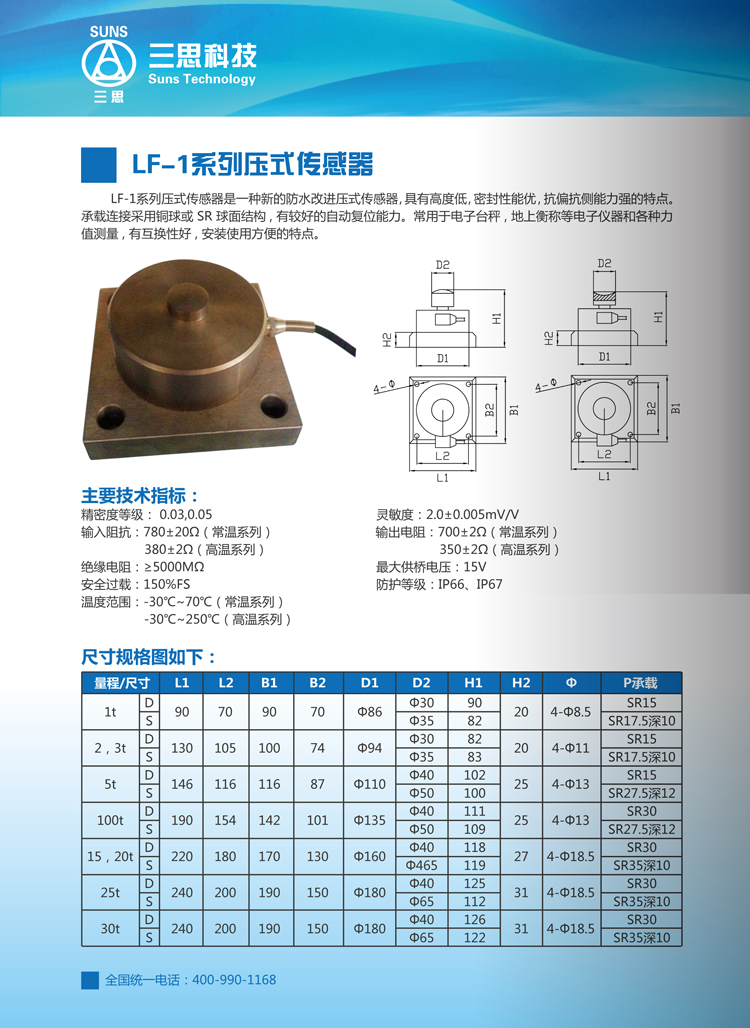 LF-1系列壓式傳感器是一種新的防水改進(jìn)壓式傳感器,具有高度低、密封性能優(yōu)、抗偏抗側(cè)能力強(qiáng)的特點(diǎn)。承載連接采用銅球或SR球面結(jié)構(gòu),有較好的自動(dòng)復(fù)位能力。常用于電子臺(tái)秤、地上衡稱等電子儀器和各種力值測(cè)量,有互換性好、安裝使用方便的特點(diǎn)。