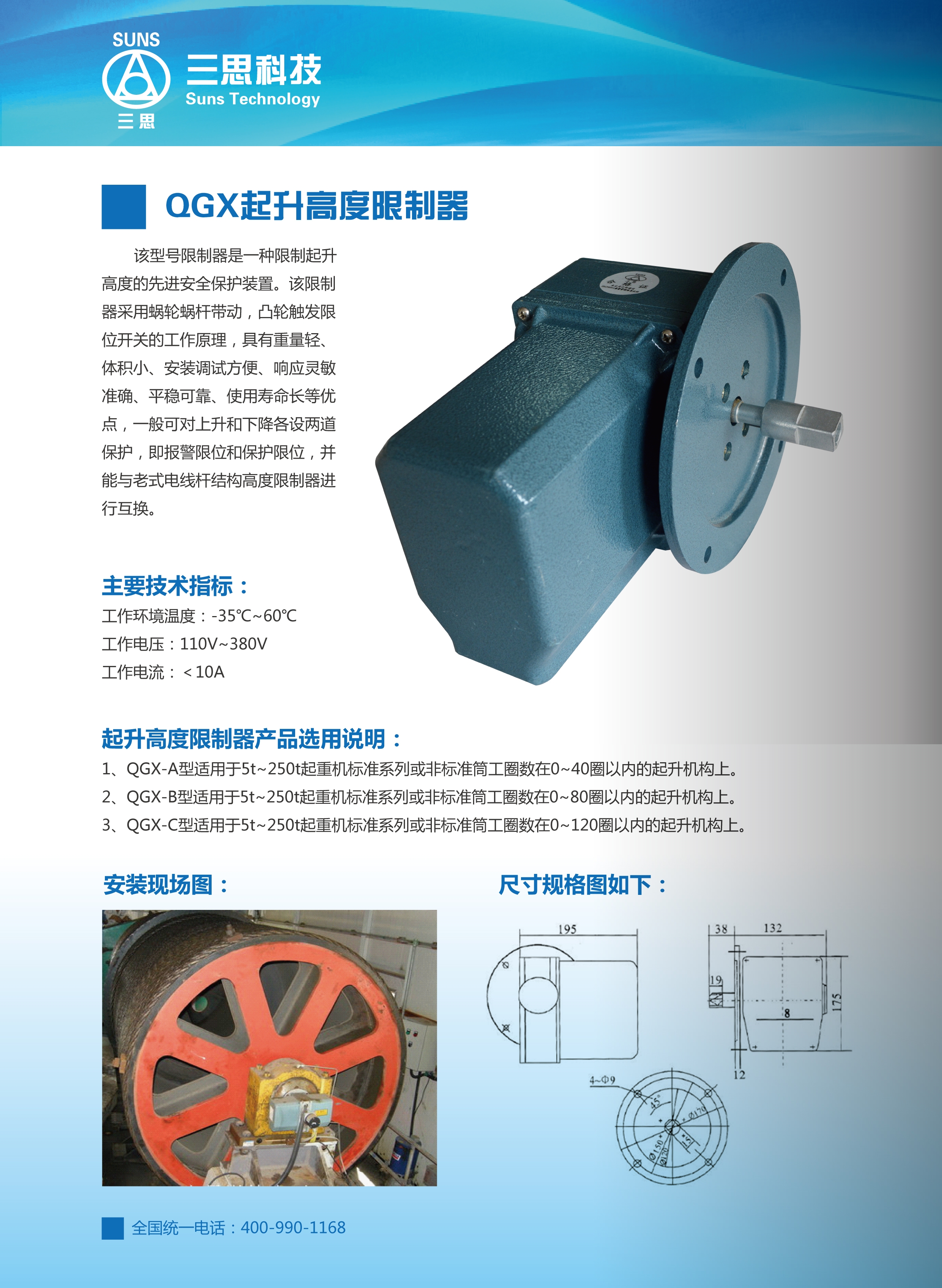 該型號(hào)限制器是一種限制起升高度的先進(jìn)安全保護(hù)裝置。該限制器采用蝸輪蝸桿帶動(dòng),凸輪觸發(fā)限位開(kāi)關(guān)的工作原理,具有重量輕、體積小、安裝調(diào)試方便、響應(yīng)靈敏準(zhǔn)確、平穩(wěn)可靠、使用壽命長(zhǎng)等優(yōu)點(diǎn),一般可對(duì)上升和下降各設(shè)兩道保護(hù),即報(bào)警限位和保護(hù)限位,并能與老式電線桿結(jié)構(gòu)高度限制器進(jìn)行互換。