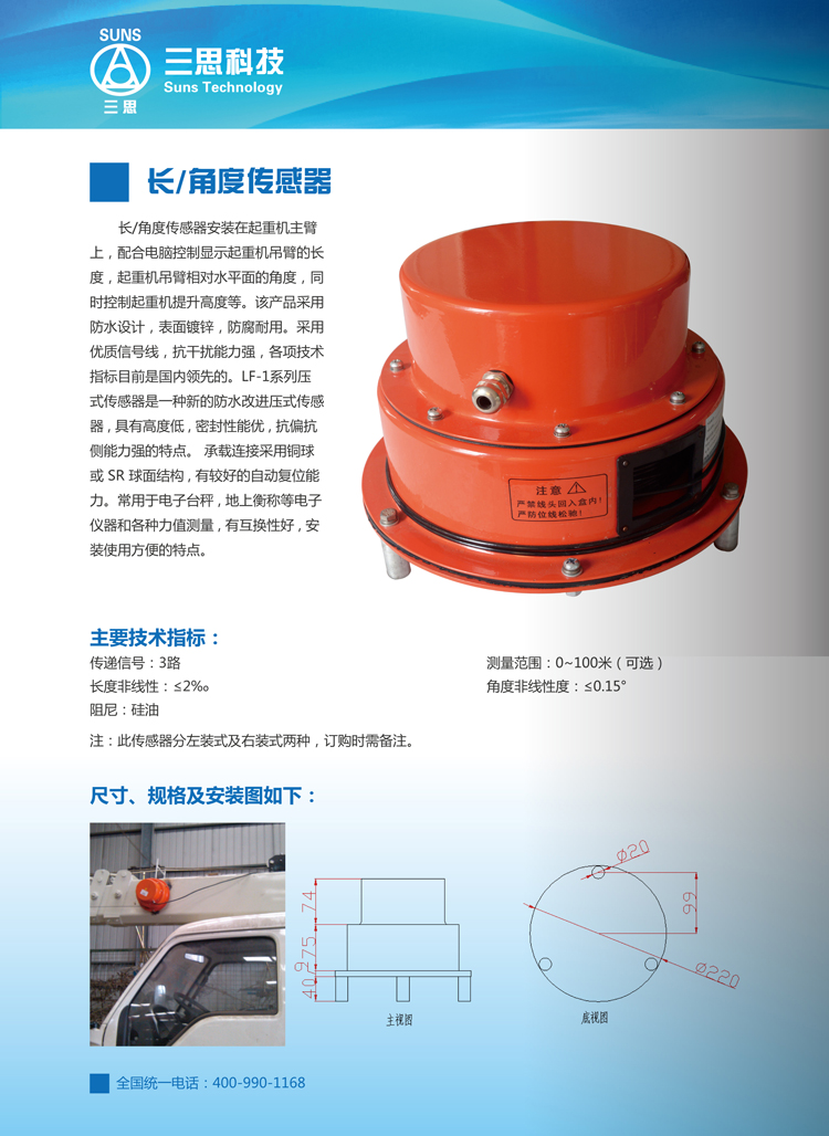 產(chǎn)品詳情 功能介紹 產(chǎn)品優(yōu)勢(shì) 參數(shù)/型號(hào) 包裝清單 產(chǎn)品詳情 長(zhǎng)/角度傳感器安裝在起重機(jī)主臂上,配合電腦控制顯示起重機(jī)吊臂的長(zhǎng)度,起重機(jī)吊臂相對(duì)水平面的角度,同時(shí)控制起重機(jī)提升高度等。該產(chǎn)品采用防水設(shè)計(jì),表面鍍鋅,防腐耐用。采用優(yōu)質(zhì)信號(hào),抗干擾能力強(qiáng)。 功能介紹 產(chǎn)品優(yōu)勢(shì) 參數(shù)/型號(hào) 包裝清單